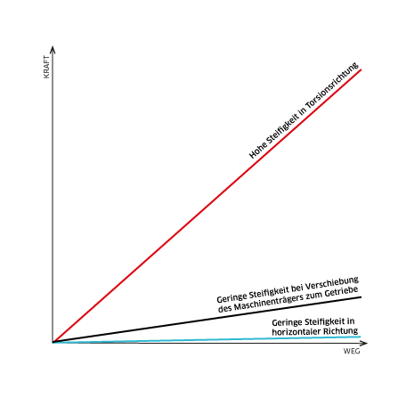 Eine spezielle Ausführungsform der Drehmomentstütze ist die Pendelstütze. Diese ist mit mehreren Konuslagern ausgeführt und ermöglicht so eine sehr weiche Lagerung. Es können Betriebsverformungen von bis zu 15 mm aufgenommen werden. Die Steifigkeit in Querrichtung ist ebenfalls sehr gering.